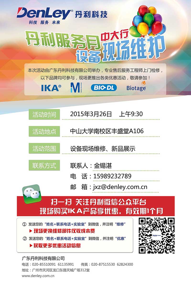 2015年3月26日上午9:30廣東丹利科技有限公司將在中山大學(xué)南校區(qū)豐盛堂A106室舉辦--丹利服務(wù)月 設(shè)備現(xiàn)場(chǎng)維護(hù)活動(dòng),專業(yè)售后服務(wù)工程師上門檢修,IKA、密理博、寶予德、Biotage等品牌均可參與,現(xiàn)場(chǎng)更推出各類優(yōu)惠活動(dòng),敬請(qǐng)參加!