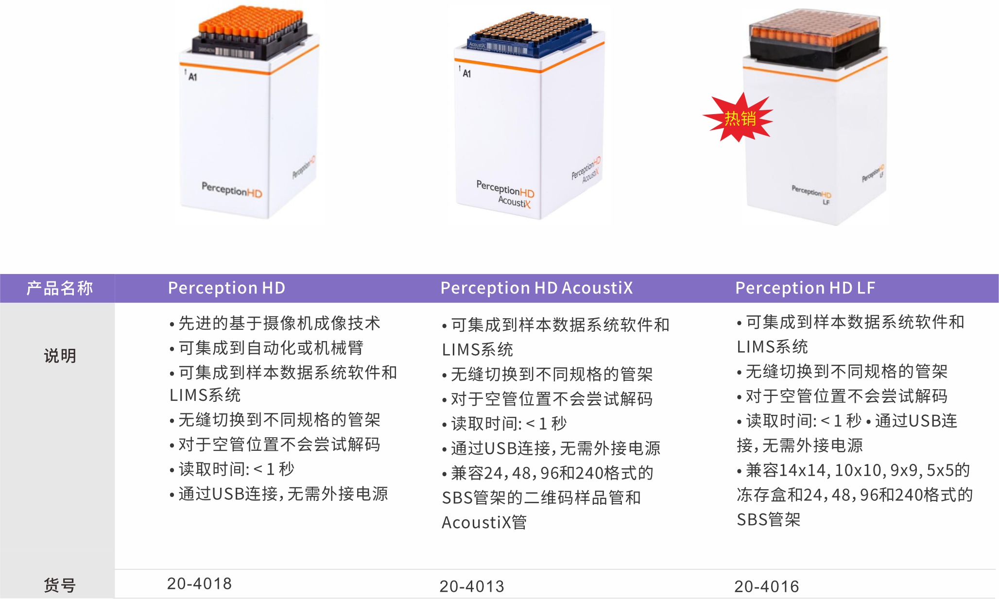 Perception 可快速識(shí)別SBS的管架以及二維碼樣品管,無(wú)需將樣品管從管家上取出即可實(shí)現(xiàn)整版樣品管信息的讀取。該系列讀碼儀不僅可讀取Azenta生產(chǎn)的二維碼樣品管,還可讀取目前市場(chǎng)上所有的二維碼樣品管??商峁┤N型號(hào):Perception HD適用于整版SBS格式的管架樣品管掃碼;Perception HD LF適用于整版SBS格式的樣品管和凍存盒格式樣品管的掃碼;Perception HD AcoustiX適用于AcoustiX聲控微量?jī)龃婀艿恼鎾叽a。