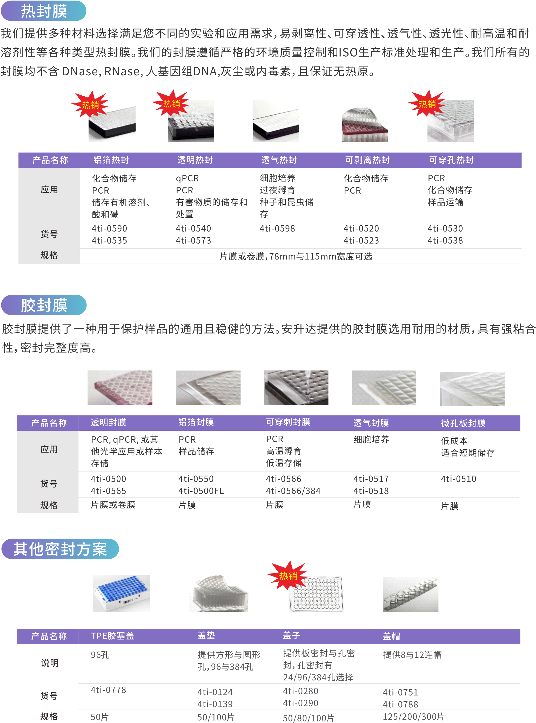 我們提供多種材料選擇滿足您不同的實驗和應用需求,易剝離性、可穿透性、透氣性、透光性、耐高溫和耐溶劑性等各種類型熱封膜。我們的封膜遵循嚴格的環(huán)境質(zhì)量控制和ISO生產(chǎn)標準處理和生產(chǎn)。我們所有的封膜均不含DNase,RNase,人基因組DNA,灰塵或內(nèi)毒素,且保證無熱原。